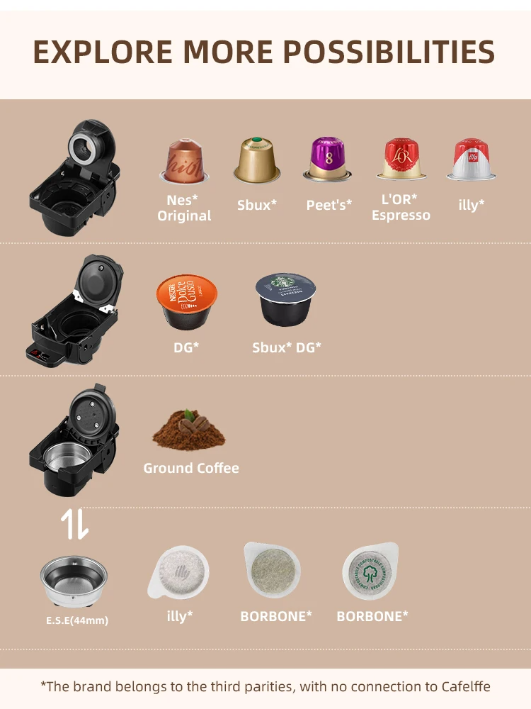 آلة قهوة Cafelffe متعددة الكبسولات هي جهاز متطور يتيح لك تحضير مجموعة متنوعة من المشروبات بأربعة أوضاع مختلفة: ساخنة وباردة، كابتشينو، إسبرسو، وكافيتيريا باستخدام أنواع متعددة من الكبسولات مثل Nespresso، ESE Pods، بالإضافة إلى القهوة المطحونة. تأتي مع مضخة 19 بار توفر ضغطًا عاليًا لتحضير القهوة بطريقة احترافية.